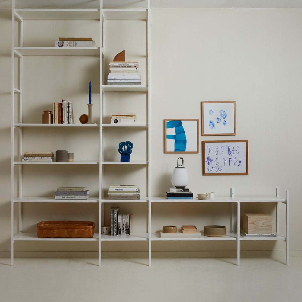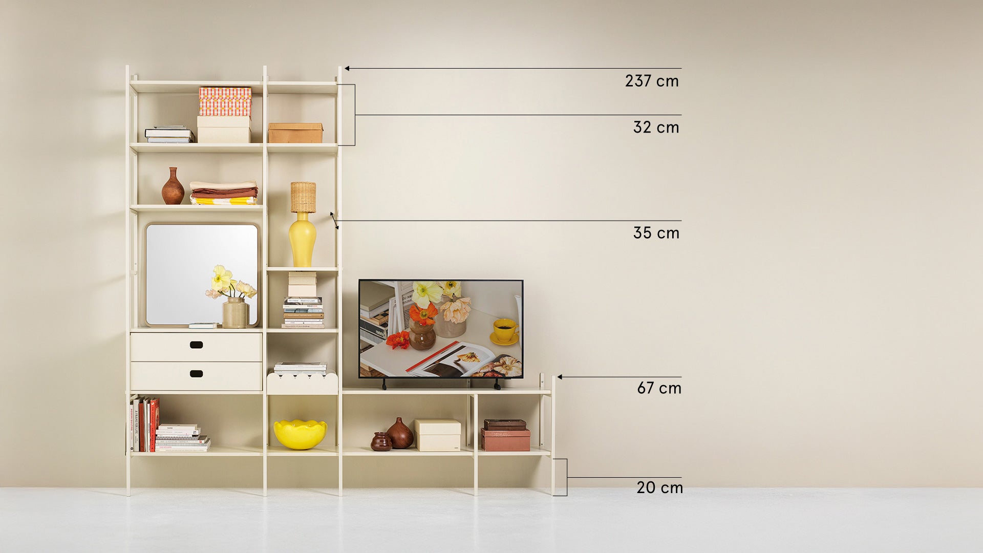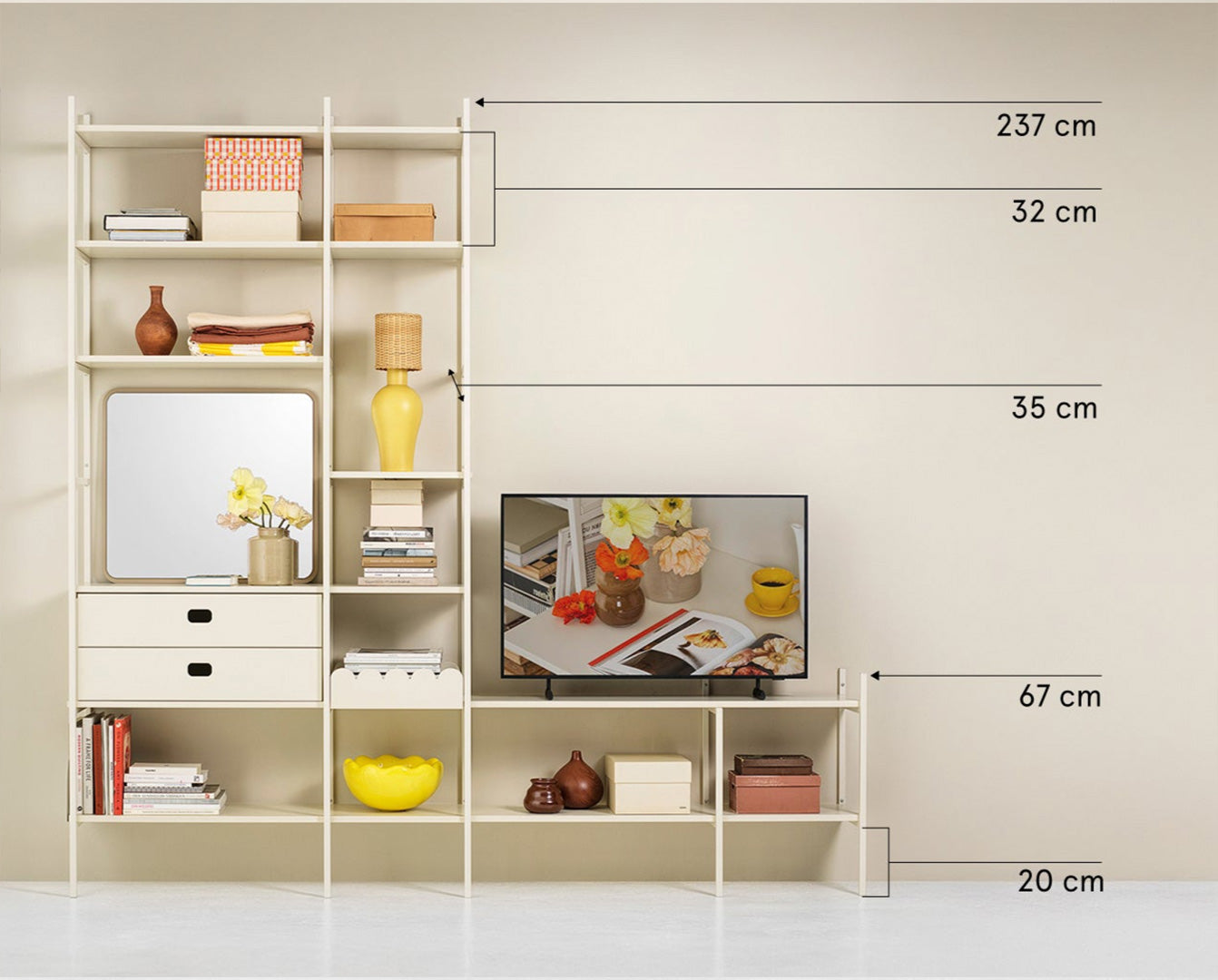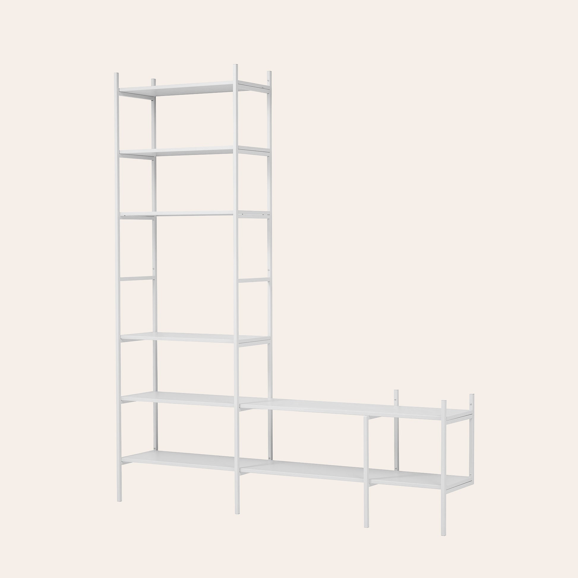 TV-Regal in Weiß – stilvolle Aufbewahrung und TV-Lösung in einem. Der niedrige Teil bietet Ihrem Fernseher dezenten Platz, während der hohe Teil viel Raum für Bücher und persönliche Gegenstände schafft. Gemeinsam bilden sie eine harmonische Lösung, die alles an einem Ort vereint. Diese Kombination ist 201 cm breit.