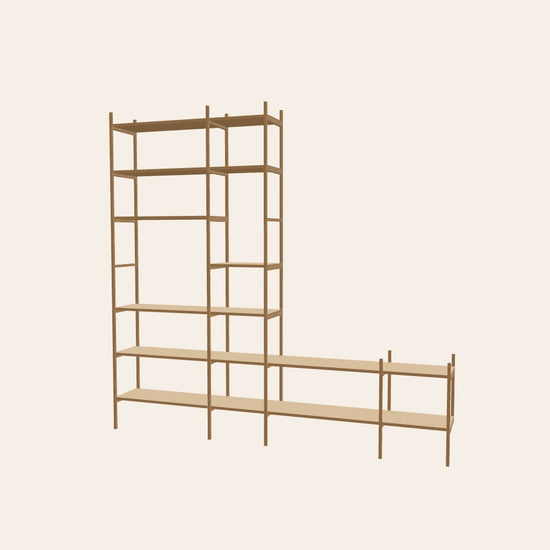 TV shelf in camel – stylish storage and TV solution in one. The low section holds your TV in a discreet way, while the tall section offers plenty of space for books and personal items. Together, they form a cohesive solution that brings everything together in one place. This combination is 246 cm wide.