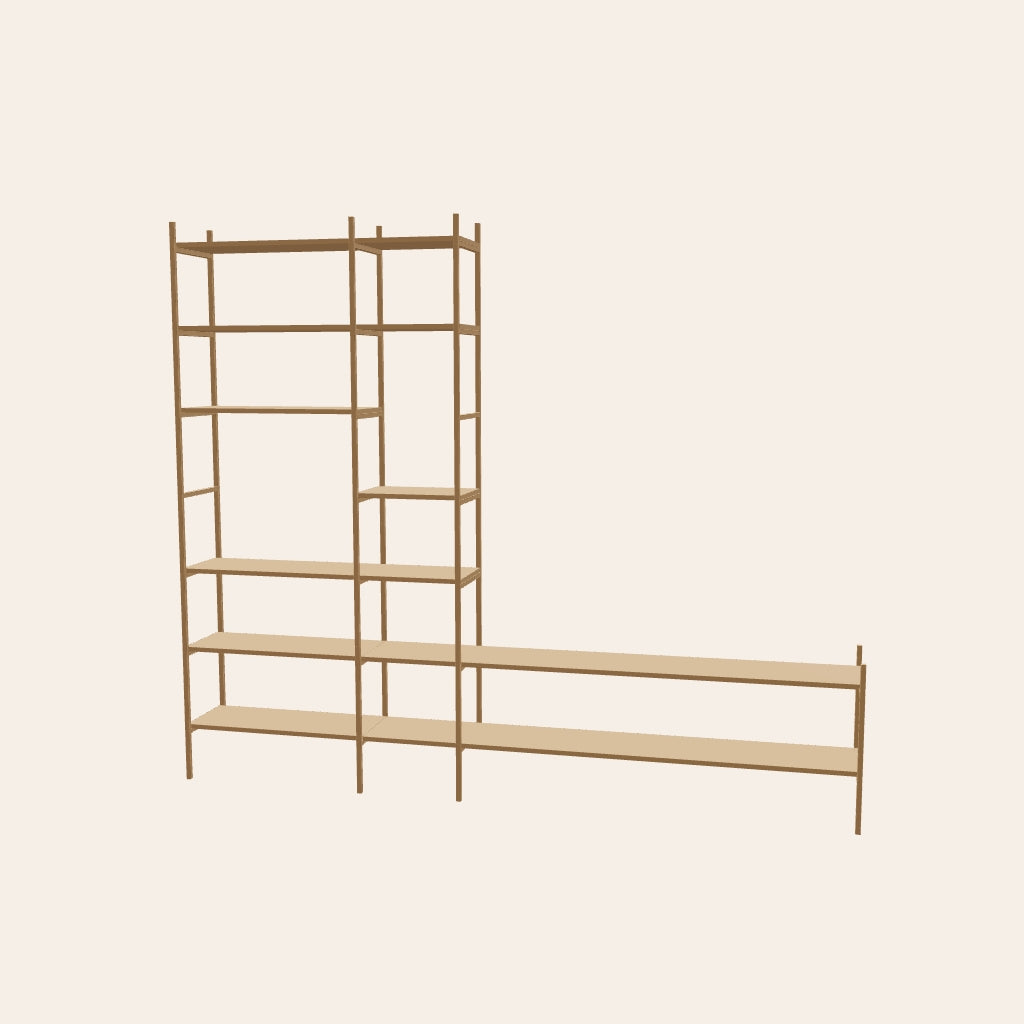 TV shelf in camel – stylish storage and TV solution in one. The low section holds your TV in a discreet way, while the tall section offers plenty of space for books and personal items. Together, they form a cohesive solution that brings everything together in one place. This combination is 281 cm wide.
