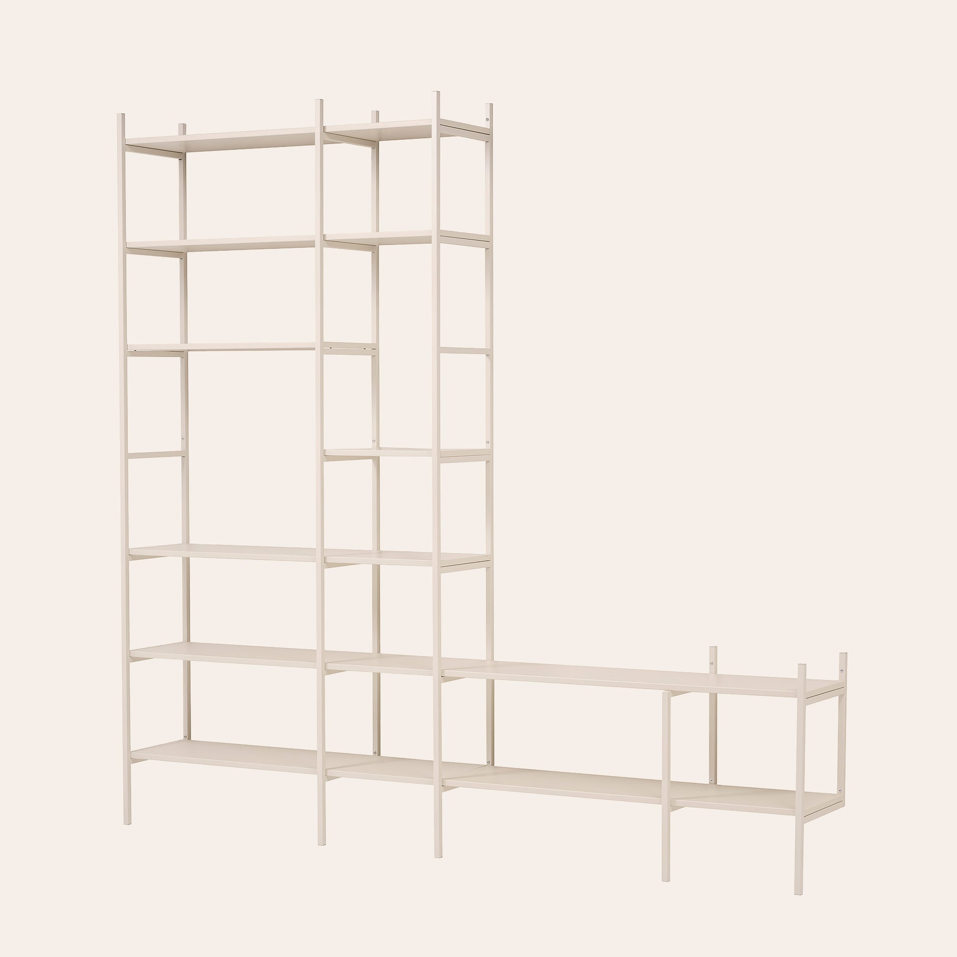 TV-hylla i färgen off-white – stilren förvaring och TV-lösning i ett. Den låga delen rymmer din TV på ett diskret sätt, medan den höga delen ger gott om plats för böcker och personliga föremål. Tillsammans bildar de en enhetlig lösning som samlar allt på ett ställe. Denna kombination är 244 cm bred.