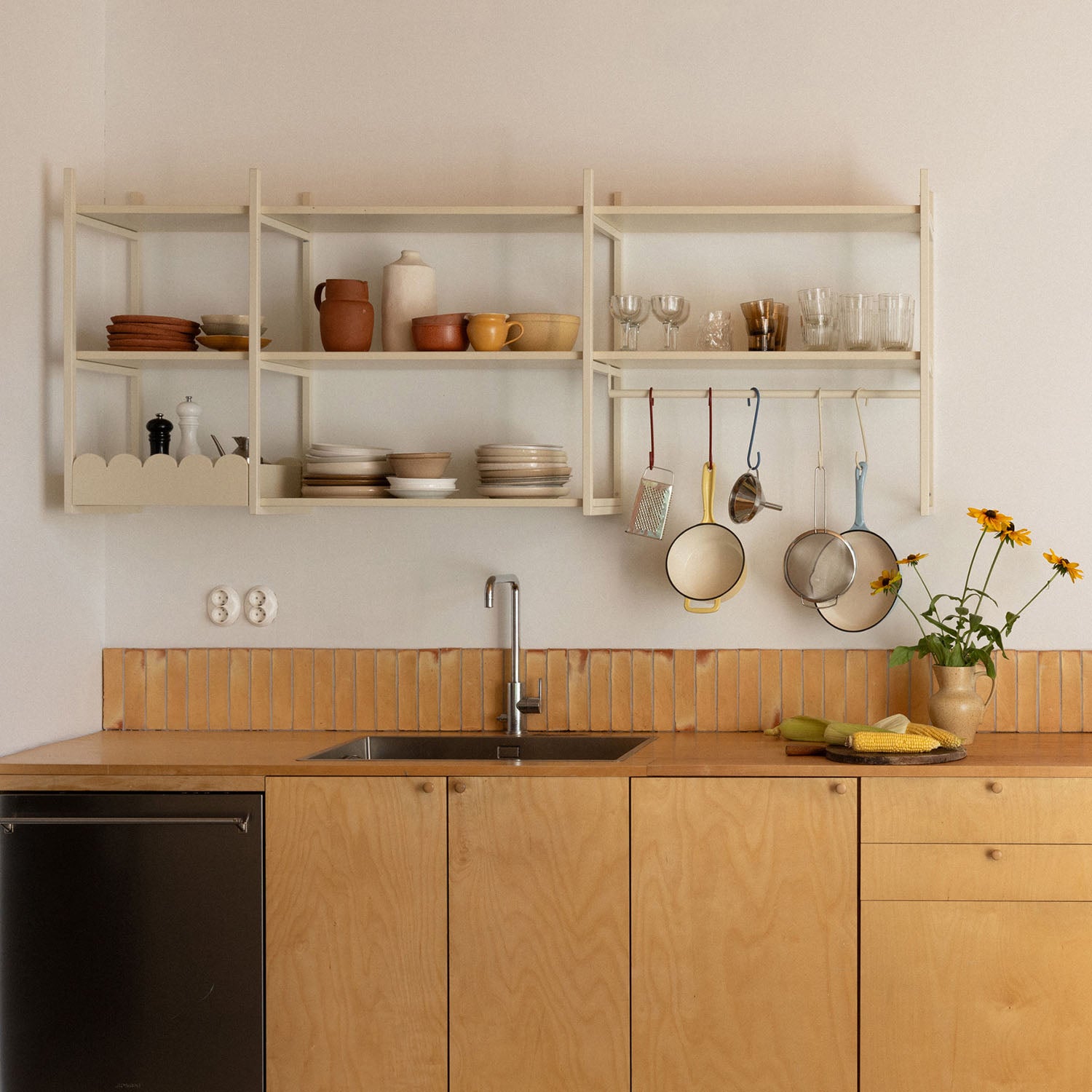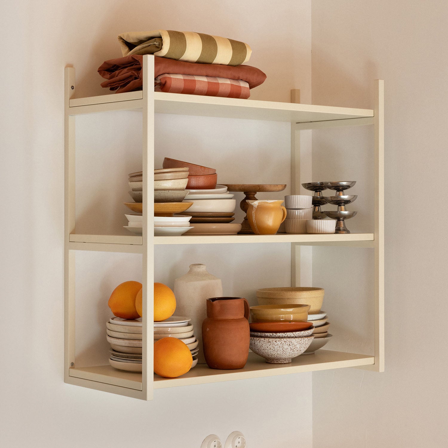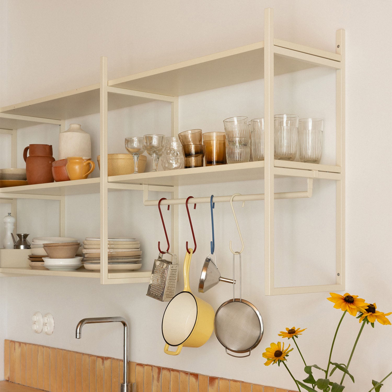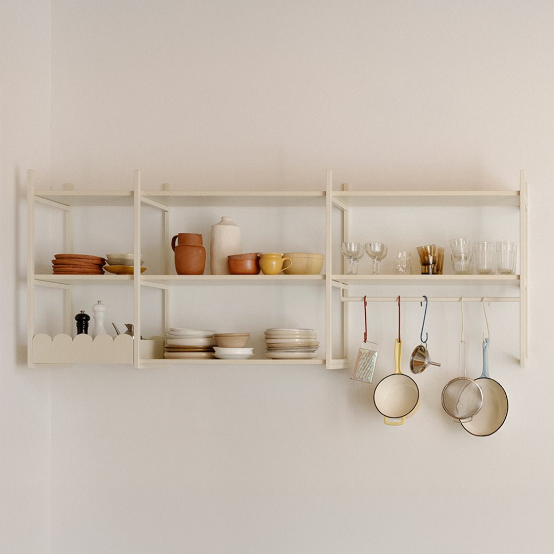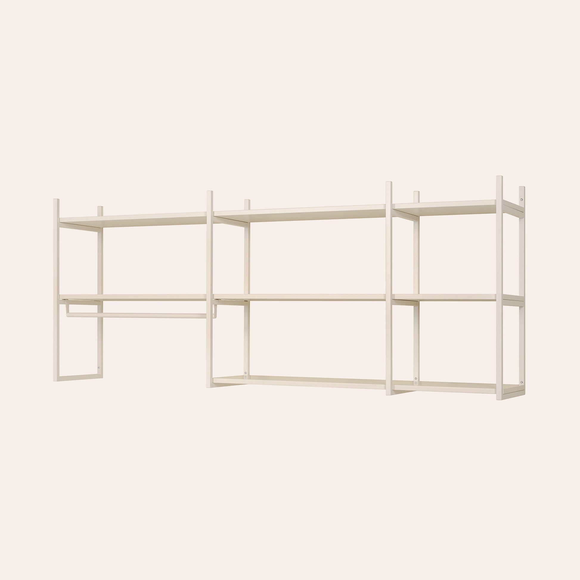 Vägghängd öppen hylla i färgen off-white, perfekt för kök, vardagsrum eller barnrum. Komplettera med en klädstång för att hänga upp allt från köksredskap till kläder, en lekfull lösning för praktisk förvaring. Denna kombination är 201 cm bred.